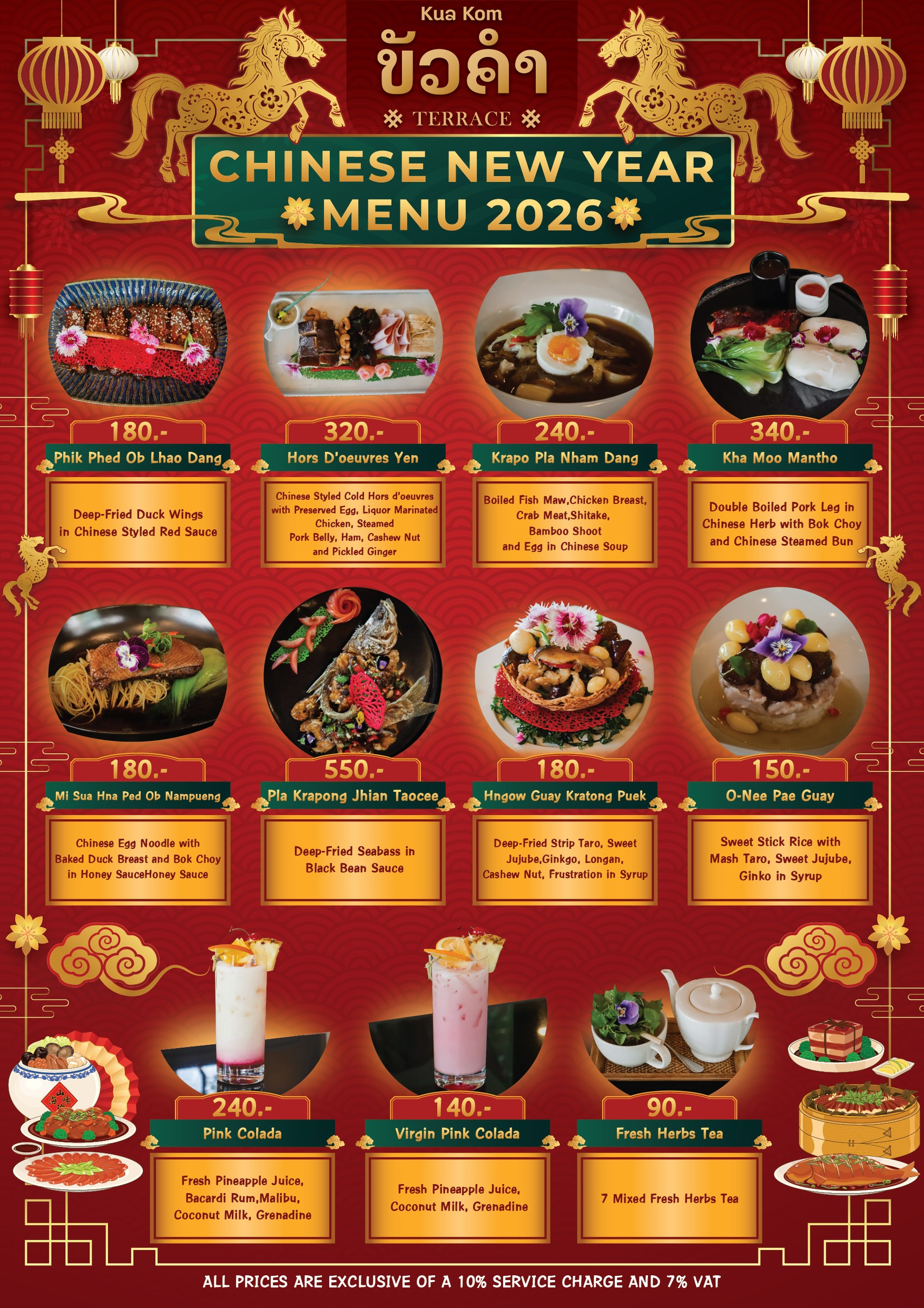 Celebrate the prosperity of the Year of the Horse at Kua Kom Terrace with our exclusive 2026 Chinese New Year Menu, featuring authentic delicacies like Deep-Fried Seabass in Black Bean Sauce and our signature Double-Boiled Pork Leg with Chinese Steamed Buns.