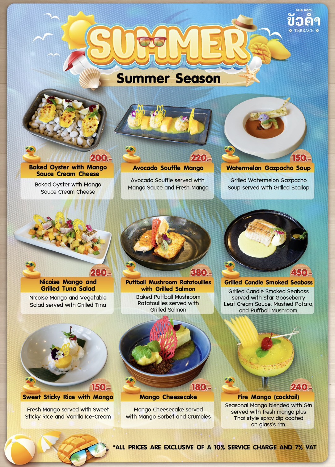 Experience the vibrant essence of summer at Kua Kom Terrace with our exclusive seasonal menu. This curated selection features a fusion of fresh seafood and tropical flavors, highlighting the best of the season's harvest.Summer Season HighlightsAppetizers and Starters- Baked Oyster with Mango Sauce Cream Cheese: A unique blend of savory oysters and creamy, tropical sweetness.- Avocado Soufflé Mango: Served with fresh mango and a delicate mango sauce.- Watermelon Gazpacho Soup: A refreshing chilled soup accompanied by a grilled scallop.- Nicoise Mango and Grilled Tuna Salad: A light, vegetable-forward salad featuring premium grilled tuna.